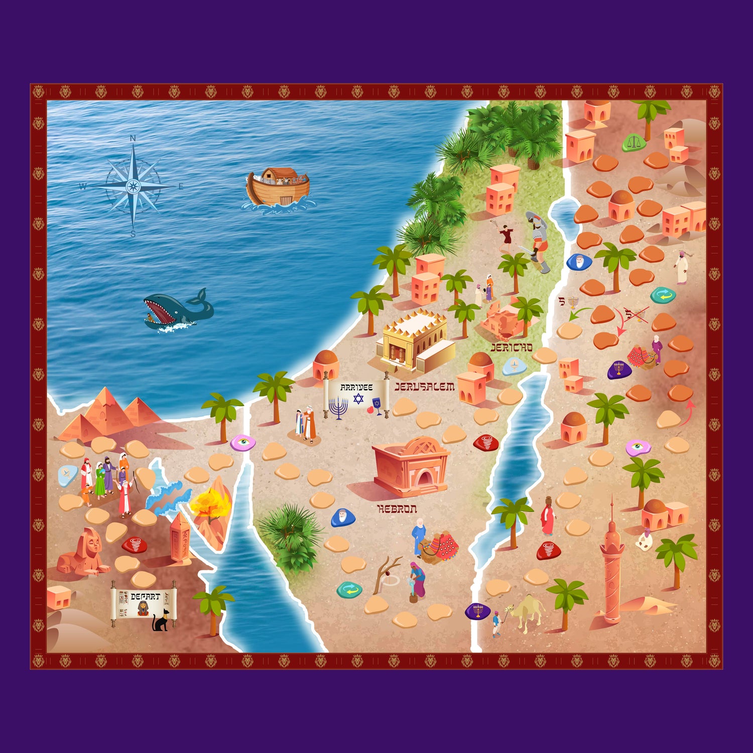 Traversez le désert, relevez des défis et résolvez des énigmes pour atteindre Jérusalem. Mais attention… sans tous vos objets sacrés, il vous faudra faire un détour avant d’entrer dans la ville sainte !
