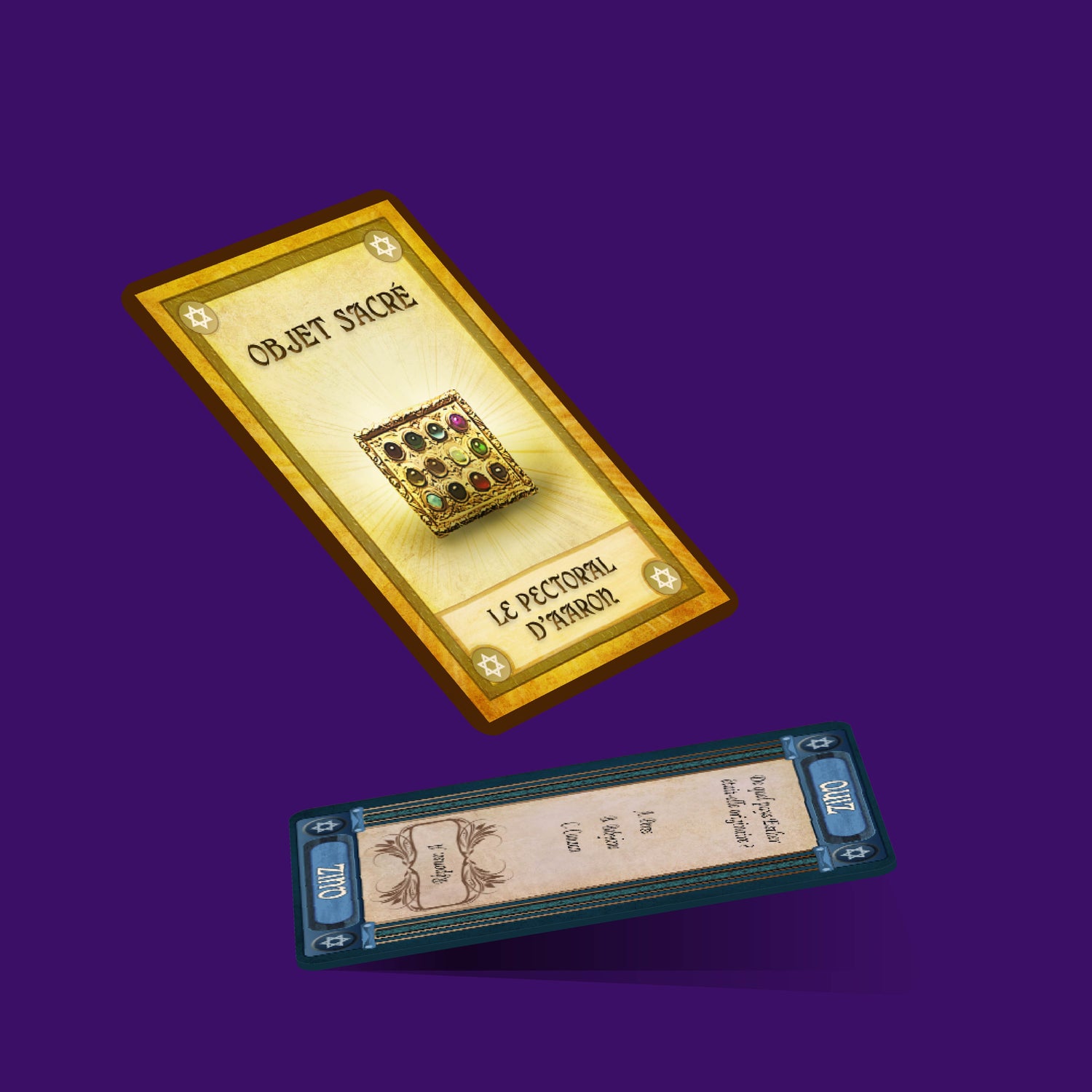 +300 cartes Quiz et Énigme basées sur la Torah. Des cartes Objet Sacré pour compléter votre collection 4 pions en forme de grenade